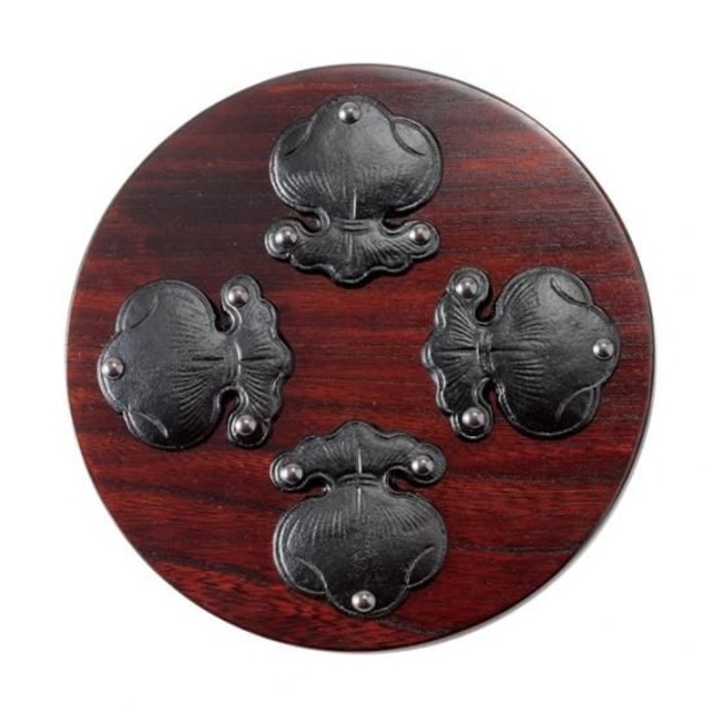 W18×D18×H1.8 欅無垢/南部鉄/拭き漆 岩谷堂箪笥の特徴でもある金具を美しい模様のように配置した鍋敷きです。 ディッシュスタンドなどに立てかけてお部屋の飾りとしてもお使いいただけます。