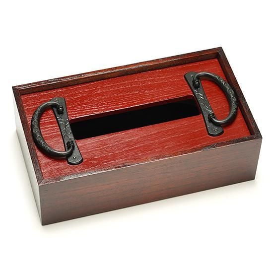 W26×D15×H8 欅化粧合板/桐無垢/南部鉄/拭き漆 蓋赤 箪笥の引き出し用に使われる引き手金具を2個使用。 引き手を持ち上げると蓋が取れて中にティッシュボックスが入れられます。