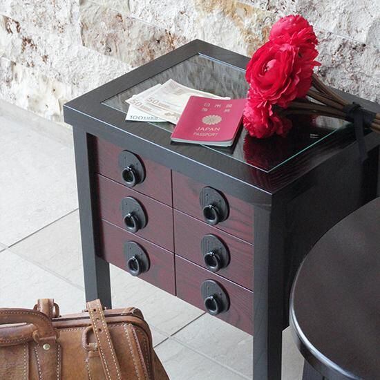 ガラストップのサイドテーブル。抽斗が4杯のものと6杯のものがあります。